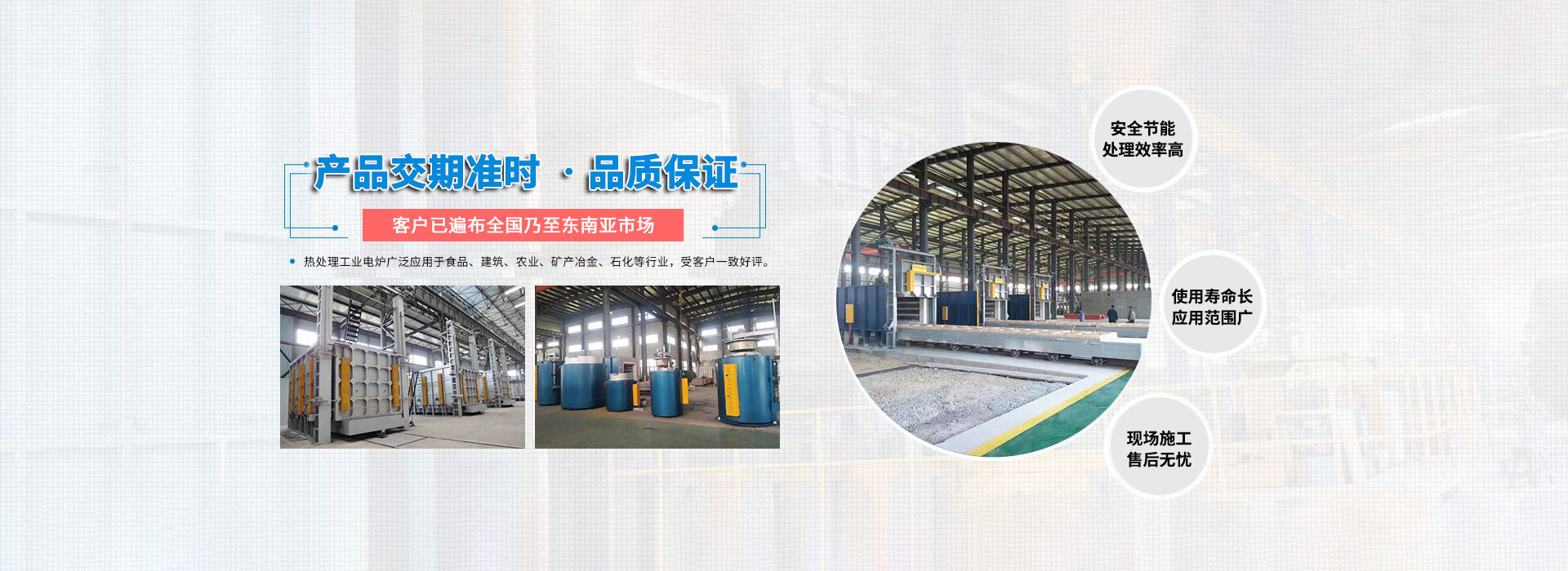 公司現有業務包括新能源電池燒結爐、連續式金剛石鋸片燒結爐、臺車爐、熱風循環爐、井式爐、罩式爐、管式爐、網帶爐、連續式滾筒爐、輥底爐、推桿爐、可傾式滾筒爐、鋼帶爐、鋁合金淬火爐、時效爐、坩堝爐、熔鋁保溫爐等??蓪ぜM行以電、天然氣、煤氣、工業燃油等為介質的真空、保護氣氛、控制氣氛等各種自控熱處理。
